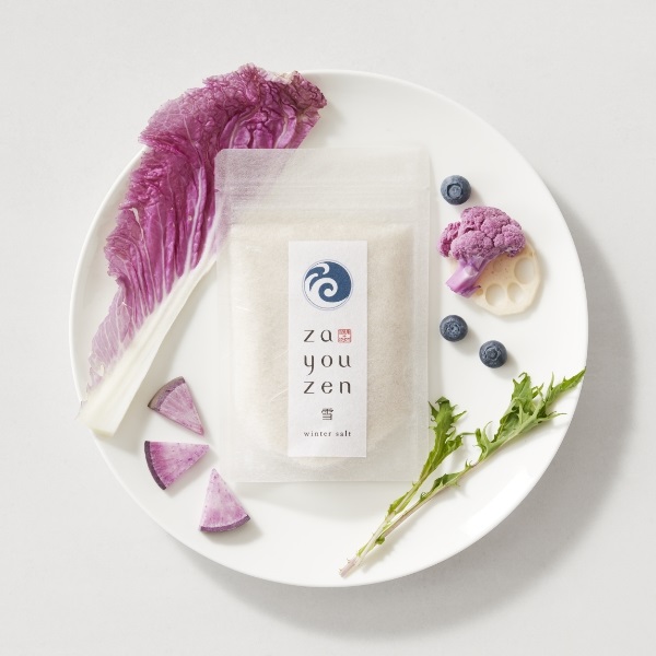 za you zenの四季の塩の「冬塩ー雪ー」。雨が少なく澄んだ冬の空気のように、雑味がなく粉雪のような味わいの塩です。 冬に旬の大根や人参など素材の旨みをグッと引き出します